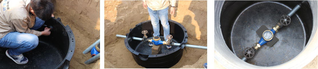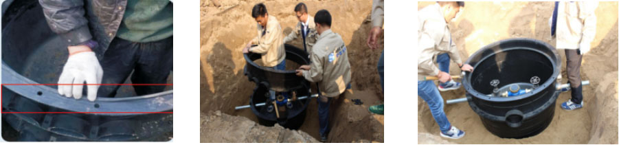 1.井座與管道之間,加柔性膠圈確保密封。2.用管鉗緊固連接處,支撐水表、閥門。 3.可根據施工條件的需要,給井座預留滲透孔。