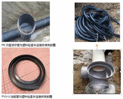塑料檢查井與塑料排水管材之間通常采用橡膠圈連接,也有個別特殊情況采用熱縮帶連接。