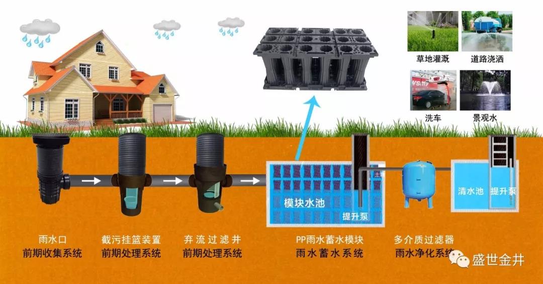 雨水落到地面后,經過初期的截污、棄流處理,截留雨水中較大懸浮物與漂浮物,水匯集并儲存到模塊蓄水池,再經過自然沉淀使雨水中的懸浮物質(主要是可沉固體)在重力作用下沉淀,從而雨水分離,并經過對收集的雨水進行處理后達到符合設計使用標準的系統。